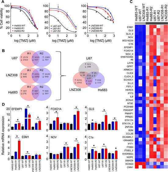 Figure 1: Identification of EFEMP1 as differentially expressed transcript in TMZ-resistant glioblastoma cells. A, Hs683, U87, and LNZ308 glioblastoma cells (WT) and TMZ-resistant subclones (R1 and R2) were analyzed for TMZ sensitivity by automated cell counting at four days after TMZ treatment. B, number of differentially expressed transcripts overlapping between resistant subclones R1 and R2 of each individual glioblastoma cell line (left) and number of overlapping transcripts among the resistant glioblastoma subclones (right). C, transcripts that were differentially expressed in at least five out of six TMZ-resistant glioblastoma subclones are shown in heatmap format. D, the top-6 transcripts overexpressed in all six resistant subclones were validated by qRT-PCR. Shown are averages, error bars indicate SD. *p<0.05 t test.
