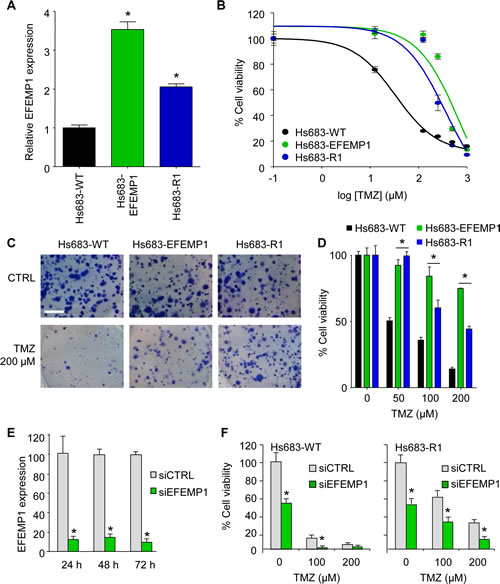 Figure 2: EFEMP1 induces TMZ-resistance in glioblastoma cells. A, EFEMP1 mRNA expression levels of Hs683-EFEMP1, Hs683-WT and Hs683-R1 cells as determined by qRT-PCR. B, Hs683-EFEMP1, Hs683-WT, and Hs683-R1 cells treated with TMZ and cell viability measured after four days. C, representative images of the effect of EFEMP1 overexpression in Hs683 cells on TMZ sensitivity as measured by clonogenic assays. Size bar, 5 mm. D, quantification of C. E, knock down of EFEMP1 using siEFEMP1 or siCTRL in Hs683-R1 cells 48 hrs after transfection as determined by qRT-PCR. F, cell viability of cells depicted in E upon TMZ treatment as determined by a clonogenic assay. Shown are averages, error bars indicate SD. *p<0.05 t test.
