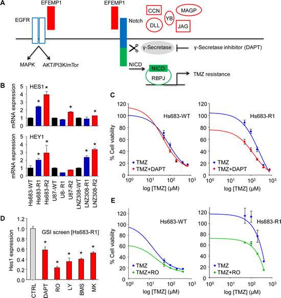 Figure 3: EFEMP1 induces Notch signaling in glioblastoma cells. A, schematic overview of EFEMP1 activation of EGFR [19] and Notch [22] signaling. MAGP-1/2, CCN3, YB-1, DLL, and Jagged are alternative Notch ligands [46-48, 50, 51]. B, mRNA expression of the Notch-induced genes HES1 and HEY1 in the TMZ-resistant glioblastoma cells as determined by qRT-PCR. C, cell viability analysis of Hs683-WT and Hs683-R1 glioblastoma cells four days after treatment with TMZ and DAPT (25 µM). D, HES1 expression after treatment with clinically available GSIs RO4929097, BMS-708163, LY450139, and MK-0752 as determined by qRT-PCR. E, cell viability analysis of Hs683-WT and Hs683-R1 four days after treatment with TMZ and RO4929097 (50 µM). Shown are averages, error bars indicate SD. *p<0.05 t test.