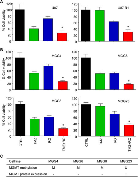 Figure 4: RO4929097 and TMZ treatment of glioblastoma cells in vitro. A, cell viability analysis of U87-WT and U87-R1 cells four days after treatment with RO4929097 (30 µM) and TMZ (100 µM). B, similar as A for a panel of primary glioblastoma cell lines. C, MGMT methylation status and MGMT protein expression of the individual primary glioblastoma cell lines used in B. Shown are averages, error bars indicate SD. *p<0.05 t test.
