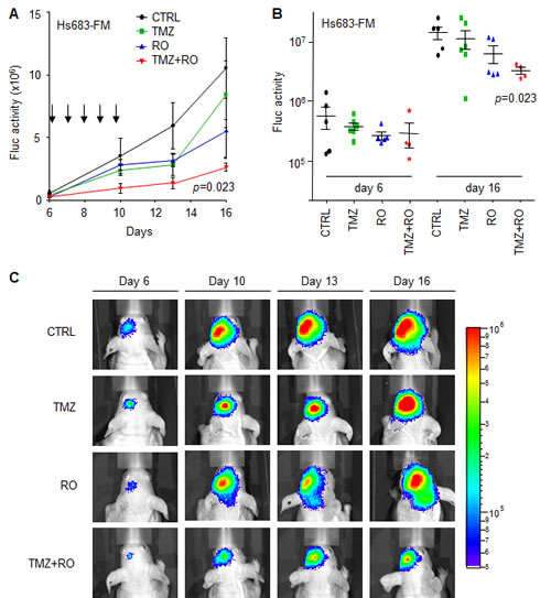Figure 5: RO4929097 and TMZ treatment of orthotopic Hs683-Fluc glioblastoma in vivo. A, mean Fluc activity values of different treatment groups measured over time using a CCD camera. Arrows indicate five consecutive treatment days starting at day six after Hs683-Fluc cells injection in the striatum of nude mice. B, Fluc activity values of individual mice per treatment group at the start of treatment (day 6) and six days after treatment had finished. C, representative Fluc bioluminescence images of treatment groups at different time points after injection of cells (day 0). Shown are averages, error bars indicate SEM. The p values indicate two-sided t-test.