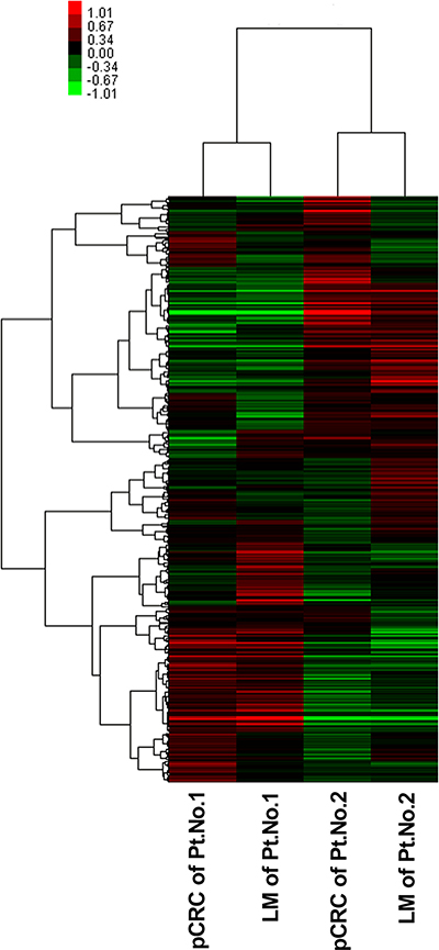 Figure 1: Unsupervised hierarchical cluster analysis of the 528 differentially expressed miRNAs. Glue Grant Human Transcriptome Array (Affymetrix, Santa Clara, CA, USA) screened the differential expression of miRNA between primary tumor and liver metastases in two pairs of fresh tissue. Green and red represent the down-regulated and up-regulated miRNAs, respectively. LM, liver metastasis; miRNA, microRNA; pCRC, primary CRC; Pt, patient.