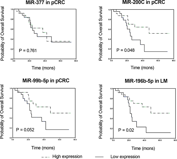 Figure 2: Kaplan-Meier survival curves of CRC patients subdivided by miRNAs levels in pCRC and LM tissues from CRC patients. Overall survival analysis based on miR-377, miR-200c, miR-99b-5p and miR-196b-5p in pCRC or LM tissues are shown. The p value was determined by log-rank test. LM, liver metastasis; miRNA, microRNA; pCRC, primary CRC.