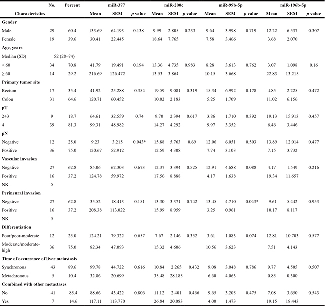 To explore the clinical significance of these liver metastasis-specific miRNAs, we further validated the correlation between microRNAs and clinicopathological characteristics. Three up-regulated miRNAs (miR-99b-5p, miR-377 and miR-200c) and one down-regulated miRNA (miR-196b-5p) in pCRC compared to liver metastasis tissues were analyzed. As shown in Table 3, increased miR-377 expression level was associated with advanced lymph node stage (p = 0.043). Likewise, decreased miR-99b-5p expression was positively correlated with perineural invasion in pCRC (p = 0.043).