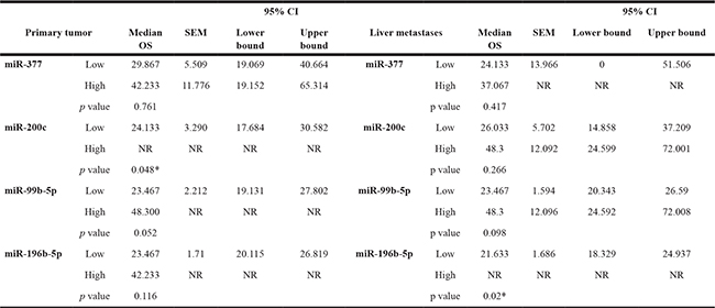 Abbreviations: CI: confidence interval; miRNA, microRNA; NR: not reached; OS, overall survival; SEM, standard error of the mean. *p ≤ 0.05.