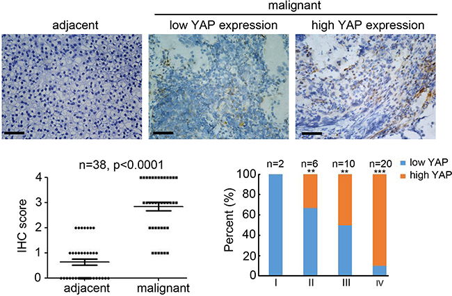 Figure 1: High expression of YAP in neuroblastoma correlated with tumor grade. (A) staining for YAP on adjacent and malignant neuroblastoma tissues. Scale bar = 100 μm. (B) IHC score of YAP expression in normal and malignant neuroblastoma tissues (n = 30; **P < 0.01). (C) Percentage of patients with high and low expression of YAP according to tumor differentiation stage. (n = 38; **P < 0.01, ***P < 0.001).