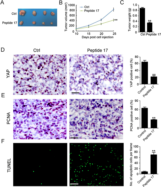 Figure 3: Knockdown of YAP inhibits neuroblastoma tumor growth in vivo. (A) representative macroscopic findings of neuroblastoma tumors. (B, C) tumor volume (n = 4; **P < 0.01), and end-stage tumor weight (n = 4;**P < 0.01) after treatment of SH-SY5Y tumors with Peptide 17 or Control (Ctrl). (D, E) IHC staining of YAP and PCNA expression in SH-SY5Y tumors. The number of YAP and PCNA positive cells and total cells were counted in 5 random fields and analyzed (**P < 0.01). (F) TUNEL assay was performed to detect apoptotic cell in SH-SY5Y tumors. The number of apoptotic cells were counted in 5 random fields and analyzed (**P < 0.01).