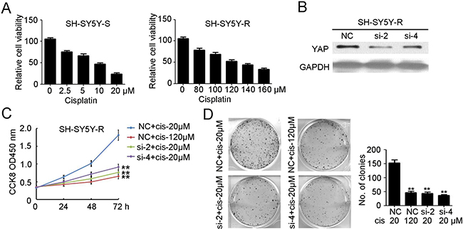 Figure 4: Knockdown of YAP inhibits the proliferation and tumorgenesis of cisplatin resistant neuroblastoma. (A) cell counting kit-8 assay was performed to determine cell proliferation of selected cisplatin sensitive SH-SY5Y cells (SH-SY5Y-S) and cisplatin resistant SH-SY5Y cells (SH-SY5Y-R) under different concentration of cisplatin treatment. Data represent the means ± SD from three independent experiments (**P < 0.01). (B) siYAP-2 and siYAP-4 were used to transfected SH-SY5Y-R cells. Total cellular extracts were prepared and subjected to western blotting using antibody against YAP. GAPDH was used as a loading control. (C) cell counting kit-8 assay was performed to determine cell proliferation of SH-SY5Y-R cells with NC or siYAP-2/4 transfected, combined with 20 μM or 120 μM cisplatin treatment. Data represent the means ± SD from three independent experiments (**P < 0.01, compared with NC + cisplatin 20 μM group). (D) colon formation assay was performed to determine tumorgenesis of SH-SY5Y-R cells with NC or siYAP-2/4 transfected, combined with 20 μM or 120 μM cisplatin treatment. Colony number was counted and analyzed. Data represent the means ± SD from three independent experiments (**P < 0.01, compared with NC + cisplatin 20 μM group).