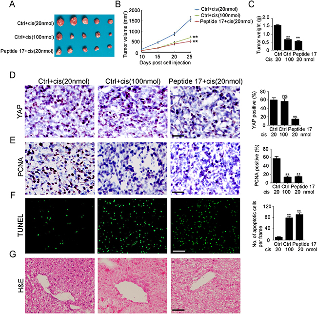 Figure 5: Knockdown of YAP inhibits cisplatin resistant neuroblastoma tumor growth in vivo. (A) representative macroscopic findings of neuroblastoma tumors. (B, C) tumor volume (n = 4; **P < 0.01), and end-stage tumor weight (n = 4;**P < 0.01) after treatment of SH-SY5Y tumors with Peptide 17 or Control (Ctrl), combined with 20 nmol/day or 100 nmol/day cisplatin treatment. (D, E) IHC staining of YAP and PCNA expression in SH-SY5Y-R tumors. The number of YAP and PCNA positive cells and total cells were counted in 5 random fields and analyzed (**P < 0.01). (F) TUNEL assay was performed to detect apoptotic cell in SH-SY5Y-R tumors. The number of apoptotic cells were counted in 3 random fields and analyzed (**P < 0.01). (G) H&E staining of liver in nude mice after treatment.