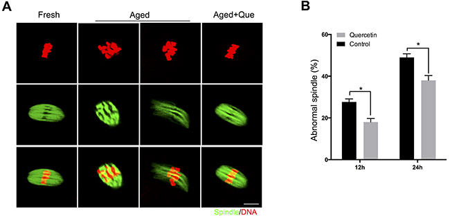Figure 4: Effects of quercetin on spindle morphology during postovulatory aging. (A) Representative images of spindle morphology in fresh, aged, and quercetin-treated MII oocytes. Scale bar: 10 μm. Que: quercetin. (B) The proportion of abnormal spindles in control or 10 μM quercetin-treated oocytes after 12 h or 24 h of aging, respectively. Data are expressed as mean ± SEM of at least three independent experiments. *p < 0.05.