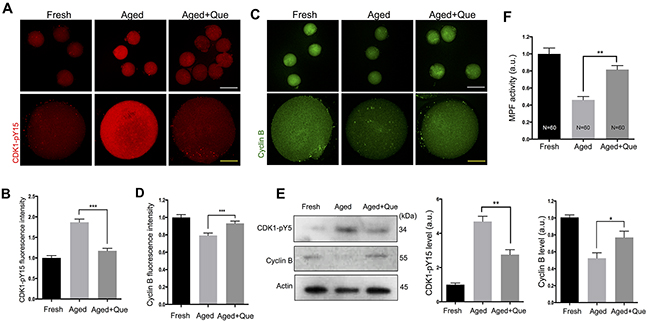 Figure 7: Effects of quercetin on MPF activity during postovulatory aging. Oocytes were cultured for 12 h with or without 10 μM of quercetin. (A) Representative images showing changes in CDK1-pY15 levels in fresh, aged, and quercetin-treated MII oocytes. Scale bars: 20 μm (Yellow), 100 μm (White). (B) Quantitative analysis of CDK1-pY15 fluorescence intensity. (C) Representative images showing changes in cyclin B levels. Scale bars: 20 μm (Yellow), 100 μm (White). (D) Quantitative analysis of cyclin B fluorescence intensity. (E) The expression levels of CDK1-pY15 and cyclin B were determined by immunoblot analyses. The normalized levels of CDK1-pY15 and cyclin B are shown. (F) MPF activity was measured in MII oocytes after 12 h of in vitro culture. *p < 0.05, **p < 0.01, ***p < 0.001. Data are expressed as mean ± SEM of at least three independent experiments. Que: quercetin.