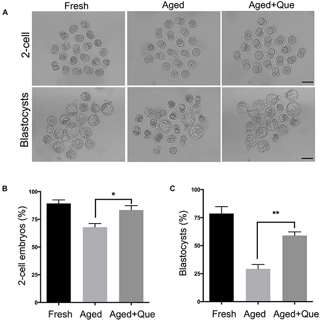 To extend our findings that quercetin ameliorates aging-associated decline in oocyte quality, we performed intracytoplasmic sperm injection on aged oocytes. Consistent with quercetin-mediated improved oocyte quality, the rate of 2-cell and blastocyst development was significantly increased after quercetin treatment (Figure 9A–9C). Therefore, our data show that quercetin effectively improves embryo development.
