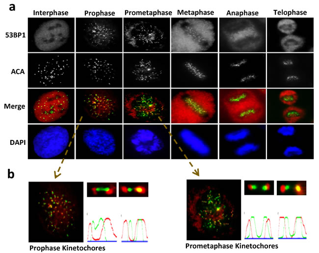 Figure 1: Unique recruitment pattern of 53BP1 at kinetochore during mitosis. a.Unsynchronized U2OS cells were plated on cover slides and processed for IF with a 53BP1 antibody (red) and anti-centromere antibody (ACA, green). Nuclei were stained by DAPI (blue). b. Selected foci were enlarged for visualization. Quantitation of fluorescent intensity using MetaMorph software obtained by drawing a 2-pixel-width line through the kinetochores.