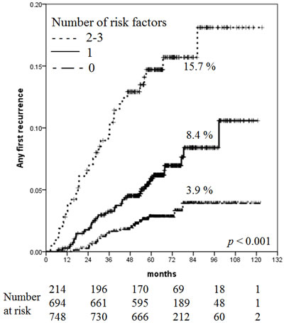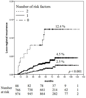 For LRR, patient age ( ≤ 40 vs. > 40 years) and tumor size (T1 vs. T2) were used to stratify the risk groups. Of all 1,828 patients, 974 (53.3%) had no risk factors, 766 (41.9%) had one risk factor, and 88 (4.8%) had two risk factors. The 5-year cumulative LRR rates were 1.6% with no risk factors, 3.2% with one risk factor, and 12.4% with two to three risk factors. The latter was defined as the high-risk group for LRR. The 7-year and 10-year cumulative LRR rates were 2.5% with no risk factors, 4.5% with one risk factor, and 12.4% with two risk factors (Figure 1).