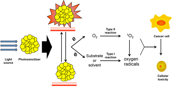 The photosensitizer (PS) requires two important features: 1) it is non-toxic to normal tissue in the dark, and 2) it cause photodamage with an appropriate light source without temperatures rise, distinguishing PDT from photothermal therapy [10, 11]. These features determine the target cytotoxicity with irradiation. Each PS has an exciting light with optimum wavelength. When exposed to this light, the electrons of the PS transition from a ground singlet state to a higher-energy-level orbit and the PS is then in an excited state. The higher-energy-level electron tends to return to its basal level spontaneously, transmitting energy to a molecule nearby [9, 12, 13]. Thus, light energy is transformed to chemical energy, induced via the PS (Figure 1).