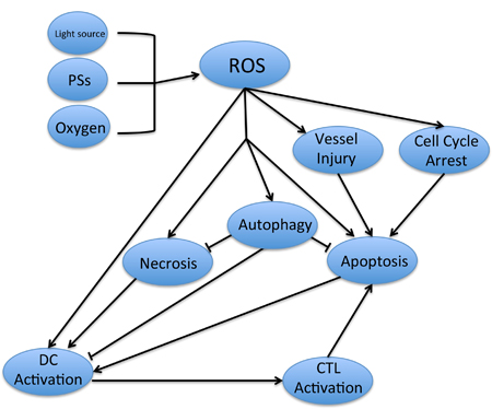 Figure 4: The relevant pathways involved in PDT-induced antitumor effect. The ROS is activated by the combination of light source, PSs and oxygen, which cause the necrosis, apoptosis and the activation of DCs in tumor cells. With the recognition of antigen on the surface of tumor cells, DCs activate the CTL and lead to the specific cellular immune to the tumor. At the same time, the ROS will promote the autophagy in cancer cells, which will reverse the cell death with the inhibition of necrosis and apoptosis. On the other hands, the tumor vessels injury and cell cycle arrest will also cause the apoptosis of cancer cells.