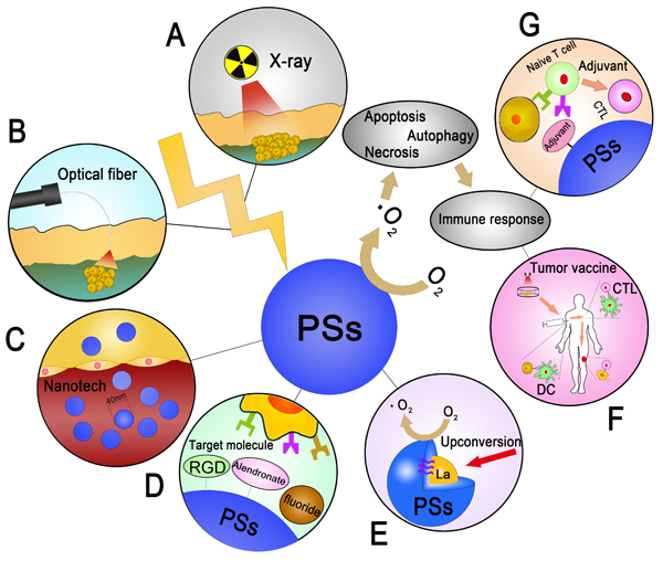 Figure 5: The summarization of seven feasible improvements to PDT in OS. A. The employment of X-ray, which has the high penetrating in various tissues B. Using the optical fiber as the conductor of laser in the skin, which avoid the epithelial tissue injury and lead to the cytotoxicity directly. C. Designing the PSs in a nano size to enhance the cycling time in body and gathering in tumor tissue induced by EPR effect. D. Combining with the target molecule and result to the gathering effect in tumor tissue. E. The combination of RE elements induced by upconversion with the core-shell structure of PSs. F. Utilization of tumor vaccine induced by PDT. G. Adjuvant- related CTL activation in PDT.