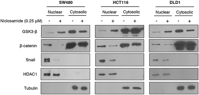 Figure 2: Niclosamide increased nuclear GSK3 activity resulting in decreased nuclear β-catenin and Snail abundance. The colon cancer cells were treated with 0.25 μM niclosamide for 24 h, and the protein abundance of β-catenin and Snail in nuclear-cytosolic fraction was determined by immunoblot analysis. HDAC1 and tubulin served as the loading control for nuclear and cytosolic fractions, respectively.