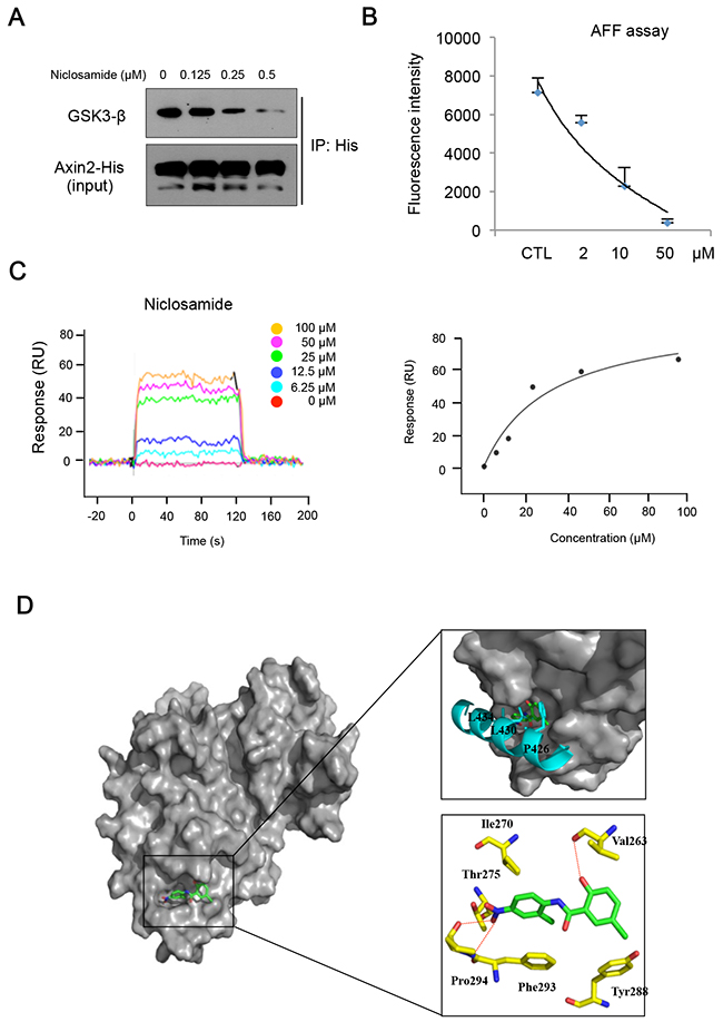 Figure 3: Niclosamide directly interacts with GSK3, inhibiting Axin binding. (A) The 293 cells were transfected with His-tagged Axin2 expression vector and treated with increasing doses of niclosamide for an 8 h period. The GSK3 binding activities in lysate were determined by Ni-NTA bead immunoprecipitation followed by immunoblot analysis for GSK3. (B) Recombinant His-tagged GSK3 was subjected to immunoprecipitation to determine FITC-conjugated Axin peptide (19 mer) binding. Remaining fluorescent intensities following incubation with different doses of niclosamide are presented from triplicate experiments. (C) Surface plasmon resonance (SPR) sensograms showing the interaction of niclosamide with immobilized GSK3 (left panel). Five different niclosamide concentrations were analyzed (0 - 100μM). Response units at equilibrium are plotted against the concentration of niclosamide (right panel). The data were analyzed using the ProteOn Manager Software 2.0. (D) Predicted binding mode of niclosamide on the Axin-binding site of GSK3 shown as surface model (left panel). Superimposition of the Axin peptide and niclosamide to demonstrate their similar binding modes within the peptide binding site of GSK3 (top right panel). Detailed interactions between niclosamide and GSK3 are shown as stick model H-bonds are indicated by red dashed lines (bottom right panel). GSK3, Axin peptide, and niclosamide are colored in yellow, cyan, and green, respectively. Figures were drawn using PyMol (Delano Scientific LLC, San Carlos, CA).