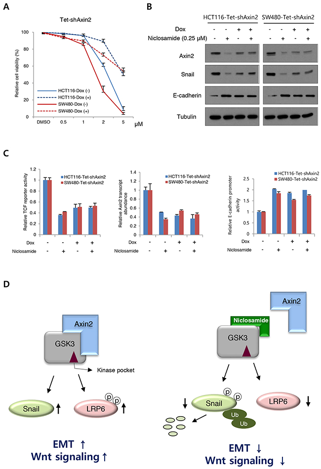 To determine on-target effects of niclosamide on cells, we next made Axin2 knockdown cells using a doxycycline-inducible system. Evaluating the cytotoxic effects of niclosamide, we found the cell viability was largely increased at μM levels by inducible Axin2 knockdown in HCT116 and SW480 cells (Figure 4A). Examining protein abundance of Snail and E-cadherin, the effects of niclosamide were largely abolished by Axin2 knockdown (Figure 4B). Further, canonical Wnt transcriptional activity, Axin2 transcript abundance, and E-cadherin reporter activity were minimally changed by niclosamide treatment in Axin2 knockdown colon cancer cells (Figure 4C), indicating that Axin2 is required for mode of action (MoA) of niclosamide on colon cancer cells. Therefore, niclosamide suppresses canonical Wnt activity and the Snail-mediated EMT program in an on-target manner by inhibiting Axin-GSK3 interaction (Figure 4D).