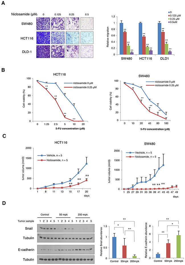 Figure 5: Niclosamide suppresses tumorigenic potential and EMT in vivo. (A) The migratory activity of colon cancer cells treated with various concentrations of niclosamide was determined by transwell migration assay (left panels). Statistical significances compared to control (right panel) are denoted as **, P < 0.01 by a two-tailed Student’s t-test. (B) Combination effect of niclosamide and 5-FU on HCT116 and SW480 cells. The colon cancer cells were treated with various concentrations of 5-FU and niclosamide as indicated. Cell viability was measured trypan blue exclusion assay after 48 h of incubation. **, P < 0.01 by a two-tailed Student’s t-test. (C) Niclosamide inhibits the growth of colon cancer cells in vivo. HCT116 and SW480 colon cancer cells were inoculated into the flank of athymic nude mice prior to 24 h of treatment. Niclosamide (50 mg/kg dissolved in Cremophor EL) was intraperitoneally administered. Two asterisks, P < 0.01 compared to the vehicle control by Mann-Whitney test. (D) Niclosamide treatment reversed Snail-mediated EMT in SW480 xenografts. Tumor-bearing nude mice were given 50 mg/kg or 200 mg/kg body weight niclosamide for 3 days prior to sacrifice. Tumor tissues were collected and the protein abundances of Snail and E-cadherin in tumor lysates were then measured using immunoblot assay (left panels). The band intensity on each blot was normalized to the loading control and the relative protein abundance is shown as the ratio to that in the vehicle control (middle and right panels). Results are shown as means and s.d. One asterisk, P < 0.01; Two asterisks, P < 0.001 compared to the vehicle control by Mann-Whitney test.