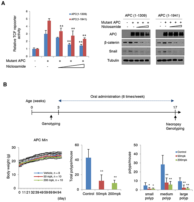 Figure 6: Niclosamide attenuates Wnt activity induced by mutant APC. (A) Niclosamide suppressed TCF/LEF transcriptional activities induced by mutant APC in a dose-dependent manner. The 293 cells were transiently transfected with mutant APC (1-1309 or 1-1941) and Topflash reporter vector. Cells were treated with increasing concentrations of niclosamide (0, 0.125, 0.25, and 0.5 μM) for 24 h. TCF/LEF transcriptional activities were quantified by measuring relative luciferase activity normalized to Renilla (left panel). The lysates of reporter assay were subjected to immunoblot assay for β-catenin and Snail (right panels). (B) Schematic diagram of experimental design for oral administration into APC-Min mice model (upper). Body weight (left), total number of polyps (middle), and size distribution of polyps (right) in small intestine (small, < 1 mm; medium 1~3 mm; large > 3 mm). Results are shown as means and s.d. One asterisk, P < 0.01; Two asterisks, P < 0.001 compared to the vehicle control by Mann-Whitney test.