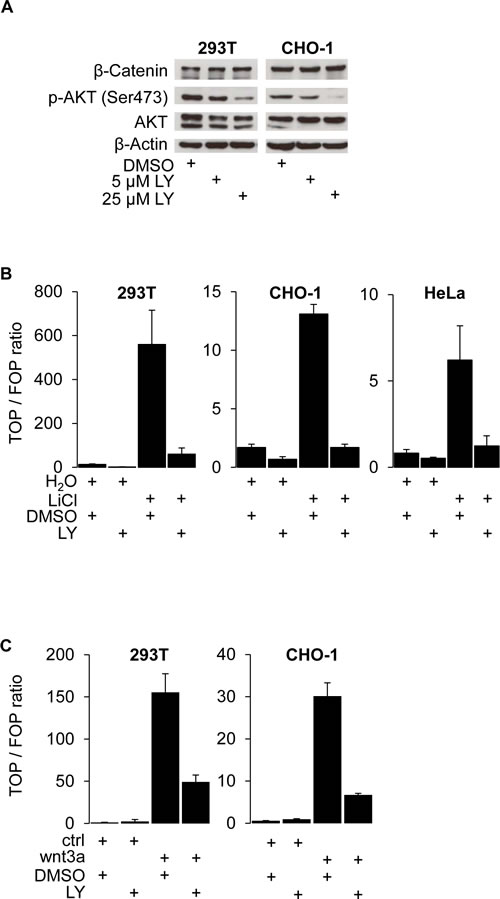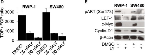 Figure 1: PI3K activity is required for β-Catenin mediated transcription and WNT target gene expression. (A) Western blot analysis of 25 μg whole cell protein lysates of 293T and CHO-1 cells treated with 25 μM LY294.002 (LY) or DMSO control for 12 hours. (B) TOP-flash luciferase reporter assay of 293T, CHO-1 and HeLa cells treated with 30 mM LiCl and / or 25 μM LY and the respective vehicles for 12 hours after transfection. (C) TOP-flash luciferase reporter assay of 293T and CHO-1 cells treated with wnt3a conditioned medium (wnt3a) or control conditioned medium (ctrl) and 25 μM LY or vehicle for 12 hours after transfection. (D) TOP-flash luciferase reporter assay of SW480 and RWP-1 cells treated with the LY concentrations indicated or vehicle for 12 hours after transfection. (E) Western blot analysis of 25 μg whole cell protein lysates of RWP-1 and SW480 cells treated with 25 μM LY for 12 hours.