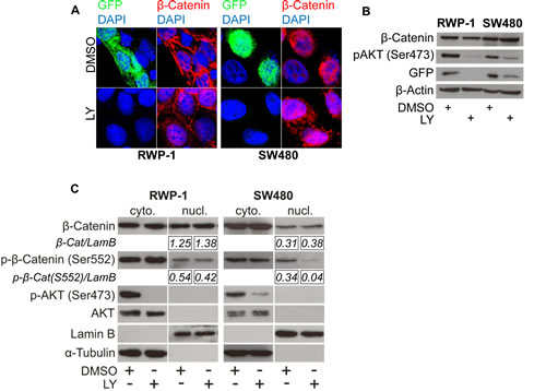 Figure 2: PI3K inhibition reduces β-Catenin mediated transcription without affecting β-Catenin subcellular localization. (A) Immunofluorescence microscopy of RWP-1 and SW480 cells transfected with pTOP-GFP reporter plasmid and treated with 25 μM LY or vehicle (DMSO) for 12 hours, stained for β-Catenin and GFP. DAPI marks nuclei. (B) Western blot analysis of 25 μg whole cell protein lysates of the remaining RWP-1 and SW480 cells from experiment (A). (C) Western blot analysis of 15 μg protein of nuclear and cytoplasmic enriched fractions of RWP-1 and SW480 cells treated with 25 μM LY or vehicle (DMSO) for 12 hours. Relative signal densities of nuclear β-Catenin and phospho-(S552)-β-Catenin expression compared to the loading control Lamin B are indicated in the boxes below each image.