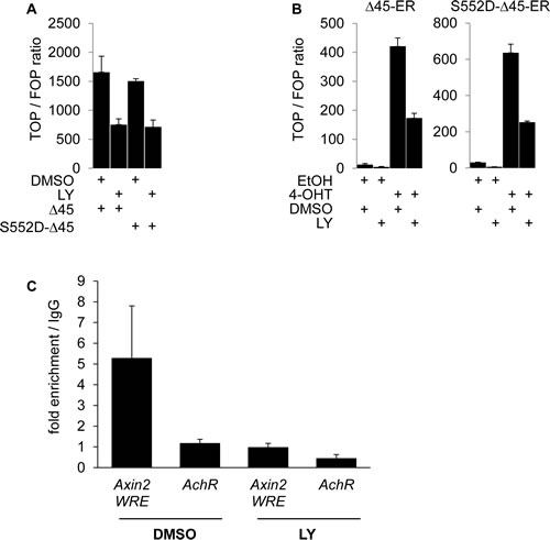 Figure 4: PI3K activity is required for β-Catenin transcriptional transactivation beyond serine 552 phosphorylation and increases β-Catenin binding to WNT target gene promoters. (A) TOP-flash luciferase reporter assay of 293T cells transiently expressing ∆45-β-Catenin (∆45) or phosphomimetic mutant ∆45-β-Catenin-S552D (S552D-∆45) treated with 25 μM LY or vehicle for 12 hours. (B) TOP-flash luciferase reporter assay of 293T cells transiently expressing ∆45-β-CateninER-myc (∆45-ER) or phosphomimetic mutant ∆45-β-Catenin-S552D-ER-myc (S552D-∆45-ER) treated with 500 nM 4-OHT or EtOH and 25 μM LY or vehicle for 12 hours. (C) Quantitative PCR analysis of immuno precipitated chromatin (ChIP) of SW480 cells treated with 25 μM LY or vehicle for 12 hours, using mouse anti-β-Catenin antibody or control mouse normal immunoglobulin G1 (IgG1). Values represent fold enrichment of anti-β-Catenin antibody precipitated DNA over control IgG1 precipitated DNA. Human achetylcholine receptor promoter, which is devoid of WNT responsive elements served as control region.