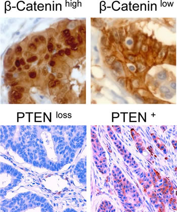Figure 5: Immunohistochemical staining of colon carcinomas using anti-β-Catenin antibody (400-fold magnification) or anti-PTEN antibody (200-fold magnification). Exemplary cases of high or low nuclear β-Catenin expression and PTEN expression or PTEN loss are displayed respectively.