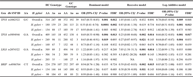 In summary, we can conclude that the TP53 (rs1042522, rs9894946G), LIG3 (rs2074522G), and BRIP1 (rs4986764) variants are involved in the susceptibility to GC, particularly in subjects infected by H. pylori. Like many other complex diseases, GC is the result of a multifactorial interplay involving environmental, lifestyle, and host genetic factors. Because the magnitude of each etiologic factor might differ among populations, larger studies in different geographic areas and ethnic groups are warranted to elucidate the contribution of DNA repair gene polymorphisms and their interactions with other risk factors in the susceptibility to GC and phenotype.