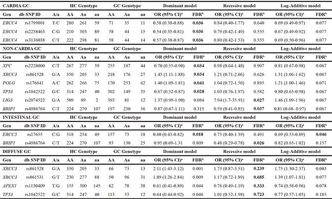 Our study has several strengths and limitations. A comprehensive analysis of 123 SNPs in candidate DNA repair genes, some of them not previously evaluated for the risk of GC, was carried out in a homogeneous population of Spanish Caucasian subjects (603 HCs and 603 GC patients). To our knowledge, the current study is the first to show a significant effect of TP53 rs9894946, LIG3 rs2074522, and BRIP1 rs4986764 variants on GC susceptibility. Moreover, additional associations with specific anatomic locations and histological subtypes of GC were observed. The fact that these associations remained significant after FDR multiple test corrections indicates that our results may not be a chance finding. However, some limitations also should be considered. In particular, although our study is one of the largest performed in Western populations, the sample size limited the power to detect small ORs, mainly in low–frequency variant polymorphisms. Taking into account the prevalence of the SNPs evaluated in our population and setting an a value of 0.05, the study had a power of 85% to detect ORs > 1.45 or < 0.70 except for the less prevalent variants (MAF: 0.05–0.10), with a power of 80% to observe OR > 1.97 in the whole data set. As a result, it is possible that we could have missed minor statistical differences, especially when subgroup analyses and assessment of gene–environment interactions were performed.