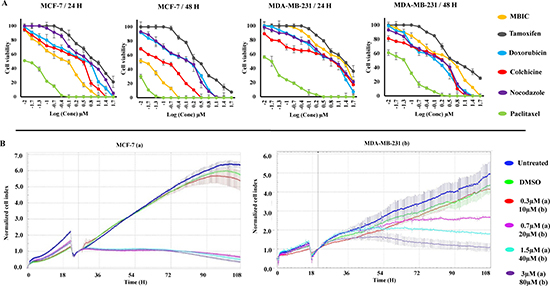 Figure 1: MBIC inhibits MDA-MB-231 and MCF-7 cell proliferation. Cells were treated with various concentrations of MBIC or DMSO for 24 and 48 h before determination of (A). Cell viability dose-dependently using MTT assay, and (B) Cell proliferation time-dependently using RTCA system for 90 h after MBIC application. All results were expressed as total percentage of viable cells of three independent experiments (P < 0.05) with mean ± SD.