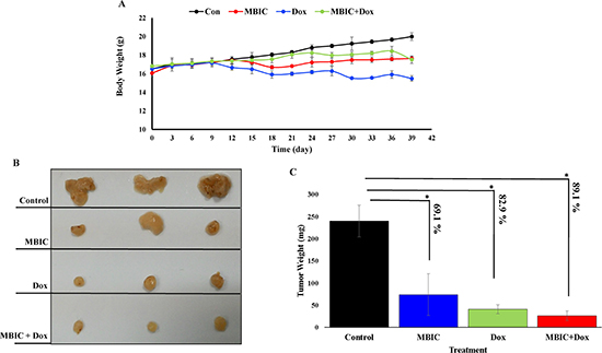 Figure 7: MBIC reduced the tumor growth in xenograft mice. (A) Body weight before treatment and during 30 days of treatment. (B) Represents photograph of tumor sizes after removing from nude mice. We can observe clear reduced size of tumor after treatment with MBIC, doxorubicin and combination treatment (MBIC with doxorubicin) compared to the DMSO-treated group. (C) Represents the tumor weights in 4 groups after removal of the tumor from animals. Figure shows 69.1%, 82.9% and 89.1% reduction of tumor weight in MBIC, doxorubicin and combination treatment groups, compared to untreated group respectively. “*” denotes statistical difference (P < 0.05).