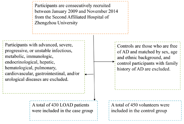 This is a case-control study. Participants are consecutively recruited between January 2009 and November 2014 from the Second Affiliated Hospital of Zhengzhou University. Clinical diagnosis of probable AD was made according to the revised criteria of National Institute of Neurological and Communicative Disorders and Stroke/ Alzheimer’s Disease and Related Disorders Association (NINCDS/ ADRDA) [16], participants with advanced, severe, progressive, or unstable infectious, metabolic, immunologic, endocrinological, hepatic, hematological, pulmonary, cardiovascular, gastrointestinal, and/or urological diseases are excluded (Figure 1). At last, a total of 430 LOAD patients are included in the study, controls are those who are free of AD and matched by sex, age and ethnic background, and control participants with family history of AD are excluded. The selection and exclusion details could be found in our previous study [17].