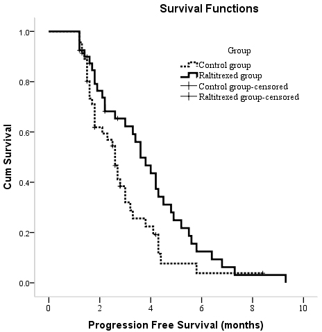 PFS times for the entire cohort ranged from 1.2 to 9.3 months, with a median time of 3.0 months (95% CI: 2.4, 3.7). In a Kaplan-Meier survival analysis, the median PFS time was 3.6 months (95% CI: 2.9, 4.4) in the raltitrexed group and 2.6 months (95% CI: 2.2, 3.0) in the control group, and this difference was significant (P = 0.038) (Figure 3).