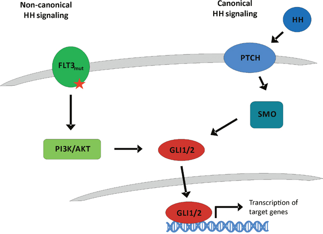 Figure 1: Classical canonical and proposed non-canonical Hedgehog signaling. In the classical canonical Hedgehog signaling cascade, Hedgehog ligands bind to the transmembrane receptor Patched-1 (PTCH1). Upon HH ligand binding, PTCH1 is internalized resulting in relief and thus activation of the receptor Smoothened (SMO) which transduces the signal to the GLI transcription factors which regulate cell fate. On the other hand, our proposed non-canonical Hedgehog cascade via FLT3 is HH ligand independent. Due to its ITD or TKD mutation, FLT3 is constitutively activated resulting in an active PI3K and AKT signaling that activates the GLI signaling cascade.