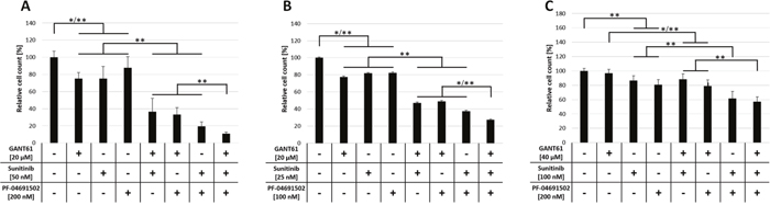 Figure 2: Anti-proliferative effects upon combined inhibition of GLI, FLT3 and PI3K in AML cell lines. MV4-11 (A), MOLM-13 (B) and OCI-AML5 (C) cells were treated with the indicated concentrations of GANT61, sunitinib and PF-04691502 alone or in combination of two or all three agents or DMSO as solvent control and the effect on the proliferation capacity was analyzed after three days by determining viable cell counts using the cell viability analyzer Vi-Cell ™ XR. Error bars represent the mean values ± standard deviation from at least three independent experiments. * P<0.05, ** P<0.001 in the Welch’s t-test.