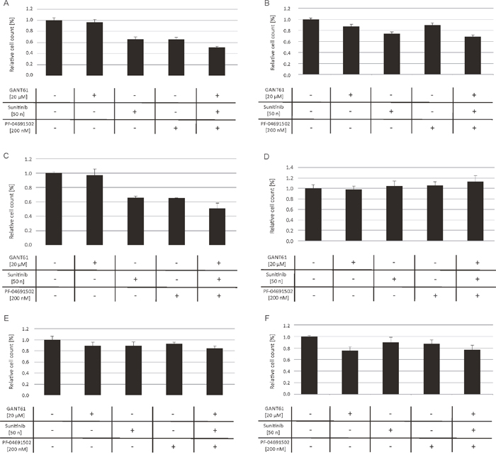 Figure 3: Anti-proliferative effects upon combined inhibition of GLI, FLT3 and PI3K in primary AML blasts. AML blasts from FLT3-mutated (A-C) and FLT3 wildtype patients (D-F) were treated with GANT61, sunitinib and PF-04691502 alone, the triple agent combination or DMSO as solvent control. The effect on the proliferation capacity was analyzed after three days by determining viable cell counts using the cell viability analyzer Vi-Cell™ XR.