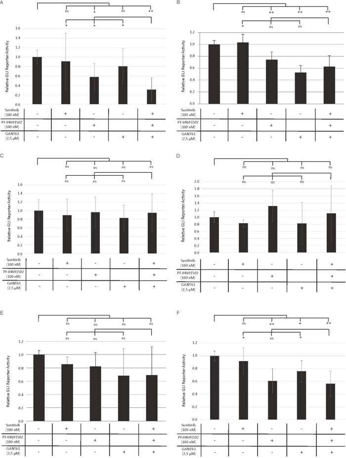 Figure 7: Decreased GLI promoter activity upon combined inhibition of GLI, FLT3 and PI3K. Stable GLI Reporter AML cells lines MV4-11 (A), MOLM-13 (B), OCI-AML3 (C), OCI-AML5 (D), IMS-M2 (E) and HL60 (F) were treated with sunitinib, PF-04691502 and GANT61 or the triple agent combination. The GLI promoter activity was measured after 24h using the Dual-GLO Luciferase Assay Kit and the Infinite F200 PRO reader. The firefly luciferase-mediated GLI promoter activity was normalized to the renilla luciferase-mediated CMV promoter activity. Error bars represent the mean values ± standard deviation from at least three independent experiments. * P<0.05, ** P<0.001 in the Welch’s t-test; ns signifies statistically not significant.