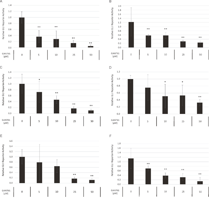 Figure 8: Dose-dependent reduction of GLI promoter activity upon GANT61 treatment. The AML Reporter cell lines MV4-11 (A), MOLM-13 (B), OCI-AML3 (C), OCI-AML5 (D), IMS-M2 (E) and HL60 (F) were treated with increasing GANT61 concentrations or DMSO as solvent control. The GLI promoter activity was measured after 24h using the Dual-GLO Luciferase Assay Kit and the Infinite F200 PRO reader. The firefly luciferase-mediated GLI promoter activity was normalized to the renilla luciferase-mediated CMV promoter activity. Error bars represent the mean values ± standard deviation from at least three independent experiments. *P<0.05, ** P<0.001 in the Welch’s t-test.