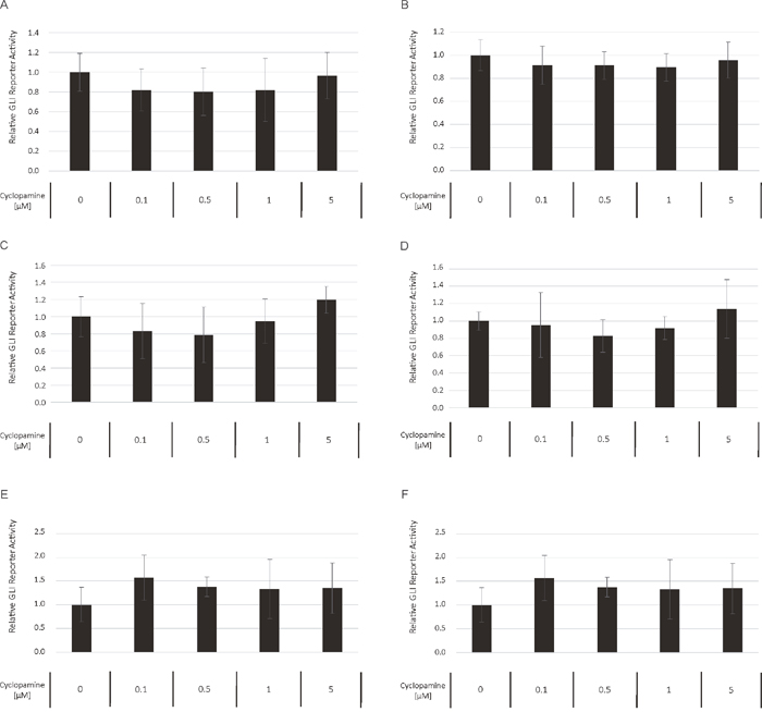Figure 9: Cyclopamine treatment has no impact on GLI promoter activity. The AML Reporter cell lines MV4-11 (A), MOLM-13 (B), OCI-AML3 (C), OCI-AML5 (D), IMS-M2 (E) and HL60 (F) were treated with increasing cyclopamine concentrations. The GLI promoter activity was measured after 24h using the Dual-GLO Luciferase Assay Kit and the Infinite F200 PRO reader. The firefly luciferase-mediated GLI promoter activity was normalized to the renilla luciferase-mediated CMV promoter activity. Error bars represent the mean values ± standard deviation from at least three independent experiments.