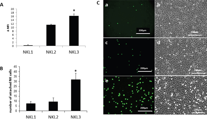 Figure 1: Adhesion of NK cell lines on endothelial cells from peripheral lymph nodes (HPLNEC.B3 cells). A. Expression of the CCL21 receptor (CCR7) on NKL1, NKL2 and NKL3 cells surface. Results represent Δ MFI (mean fluorescence intensity) from flow cytometry analysis. Values marked with a star vary significantly (p<0.05, N=5) from the NKL1 level of expression. B. Quantification of adhered NK cells counted from ten representative fields. Values marked with a star vary significantly (p<0.05, N=3) from NKL1 and NKL2 adhesion levels. C. Flow adhesion data of NKL cell lines on HPLNEC.B3 cells NKL1 (a, b); NKL2 (c, d) ; (e, f).