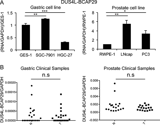 Figure 2: Quantification of DUS4L-BCAP29 expression in gastric and prostate tissues and cell lines. (A) qRT-PCR measuring DUS4L-BCAP29 expression in cell lines. Left panel is the comparison in gastric cell lines, GES-1 and SGC-7901, HGC-27 cell lines. The expression was normalized to GAPDH, and then normalized to that in GES-1. Right panel is the comparison in prostate cell lines, RWPE-1, LNCaP, and, PC3 cell lines. The expression level was normalized to GAPDH, and then normalized to that in RWPE-1. (B) qRT-PCR measuring DUS4L-BCAP29 expression in clinical samples. Left panel is the comparison in 21 gastric cancer and matched normals. Right panel is the comparison in 18 prostate cancer and 18 non-cancer prostate tissue samples. The expression level was normalized to GAPDH.