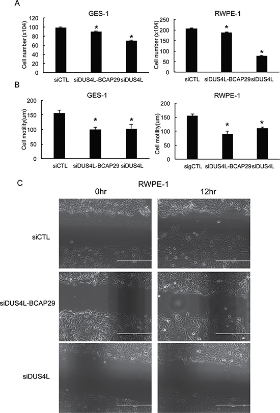 Figure 3: Loss-of-function system. (A) siRNAs silencing DUS4L-BCAP29 and wild type DUS4L decreased cell proliferation in GES-1 and RWPE-1 cell lines. The numbers of viable cells were counted three days after siRNA transfection. (B) siRNAs silencing DUS4L-BCAP29 and wild type DUS4L decreased cell motility in GES-1 and RWPE-1 cell lines. Wound healing assay was conducted after the cells achieved monolayer confluency. Distance of the wound was measured right after scratch and at a later time point. Differences of the distance were plotted. *p < 0.05 (C) Representative wound-healing assay pictures showing reduced motility in siDUS4L-BCAP29 and siDUS4L transfected RWPE-1 cells, compared with cells transfected with control siCTL. The distances of the gaps were measured and differences between two time points were compared.