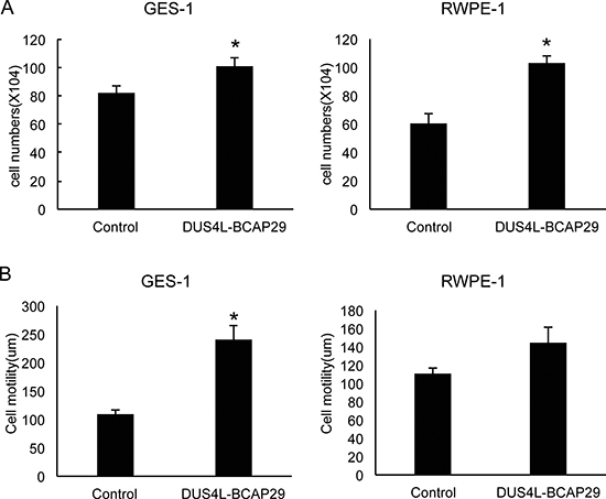 Figure 4: Gain-of-function system. Cells were transfected with either empty vector “control” or the plasmid expressing the fusion “DUS4L-BCAP29”. Stable cells expressing the fusion were selected with corresponding antibiotics. (A) Overexpression of DUS4L-BCAP29 promoted cell proliferation in GES-1 and RWPE-1 cell lines. (B) Overexpression of DUS4L-BCAP29 promoted cell motility in GES-1 and RWPE-1 cell lines. Wound healing assays were conducted on stable cells as described before. *p < 0.05