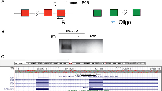 Figure 5: DUS4L-BCAP29 is a product of transcriptional read-through. (A) Scheme of the experiment. Reverse transcription was performed using an antisense primers annealing to the second exons of BCAP29 gene. A fragment between the last intron and last exon of DUS4L was then amplified using the cDNA from above. (B) In RWPE-1, the correct sized band was observed in “+RT” (with reverse transcriptase); “-RT”, no reverse transcriptase. The RNA was pretreated with DNaseI. (C) Sanger sequencing validated the PCR fragment sequence. The sequence matches the fragment as demonstrated in UCSC Genome browser.