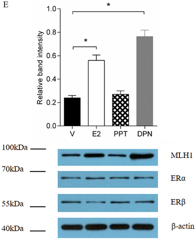 The present study demonstrates that E2 enhances MLH1 expression through estrogen receptors pathway, especially ERβ but not ERα. As shown in Figure 1A, because of large molecular weight, BSA-E2 cannot infiltrate into cells membrane or nuclear membrane. It typically binds estrogen receptors on cells membrane, such as G-protein coupled estrogen receptors, but hardly affects the nuclear receptors, ERα and ERβ for example. Besides, our results demonstrated that ICI 182.780 can block the effect of E2, and ERβ agonist significantly increased MLH1 expression. So, it can be concluded that E2 enhances MLH1 expression through estrogen receptors pathway, especially ERβ.