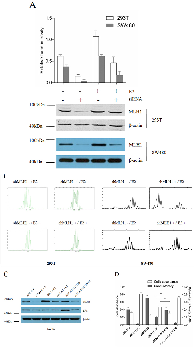 Figure 4: E2 promotes MMR via induction of MLH1 expression in vitro. (A) Western blotting of endogenous MLH1 protein. Hormone-depleted 293T and SW480 cells in six-well plates were transfected with pGPU6/GFP/Neo-shMLH1 or negative control pGPU6/GFP/Neo-NC. At 24 h post-transfection, cells were treated with 10 nM E2 or vehicle for 48 h, then total protein were extracted and analyzed by Western blotting. (B) Microsatellite instability of 293T cell. Cells were transfected as part A. At 72 h post-transfection, total DNA were extracted, and MSI were analyzed by capillary electrophoresis. (C) Protein expression assay. SW480 cell lines were seeded in 6-well plates and divided into 6 groups, then each group was transfected with shNC (negative control), shMLH1 plasmid, or shMLH1 combined with ERβ expression plasmid. At 6 h post-transfection, cells were treated with vehicle, 10 nM E2 or 10 nM E2 plus 1 μM PHTPP. After 6 h, cells in every group were treated with 100 μM 5-FU and incubated for another 12 h. MLH1 and ERβ proteins were analyzed by Western blotting. (D) Cells viability and MLH1 expression level. SW480 cells were treated as indication in part A. Then cells viability were detected by CCK-8 kit, Relative band identity of MLH1 was shown as gray group. (* p < 0.05).