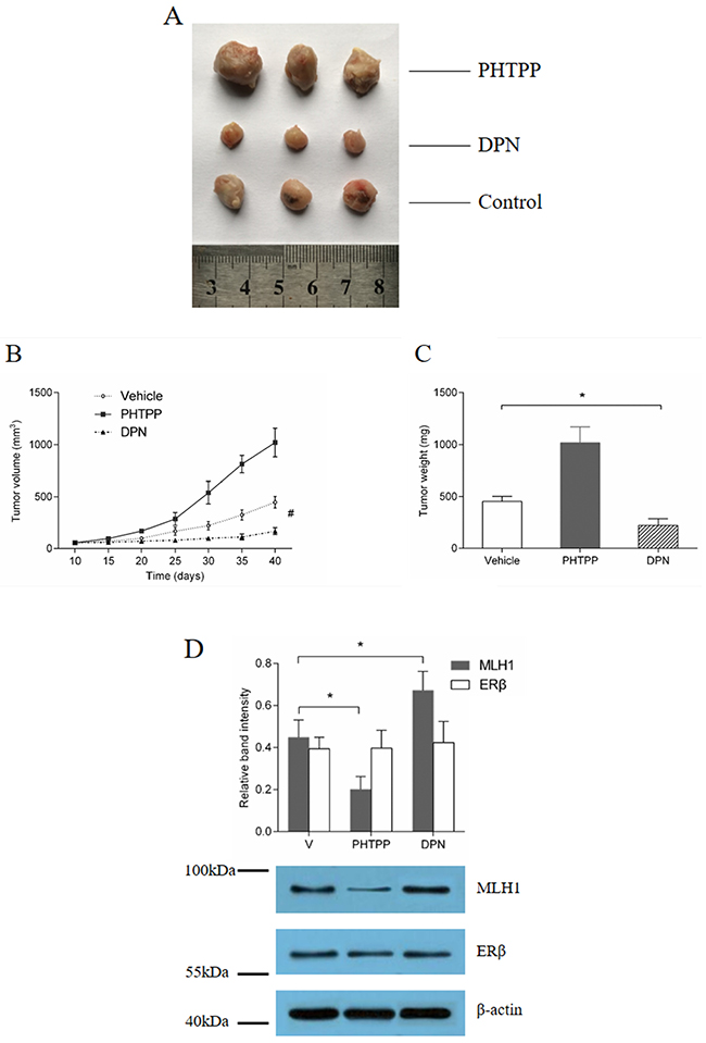 Figure 5: ERβ agonist inhibition of tumor growth in vivo, under treatment of 5-FU. (A) tumor volume and (B) weight assay. Ovariectomized mice had HT29 cells implanted subcutaneously, and received treatment with DPN, PHTPP or Vehicle, combined with 5-FU respectively. Tumor size was observed every 5 days. (C) Protein expression analysis. Western blotting was used to analyze MLH1 and ERβ expression in the xenografts of each group. # p < 0.01 compared with control group. * p < 0.05 compared with control group.